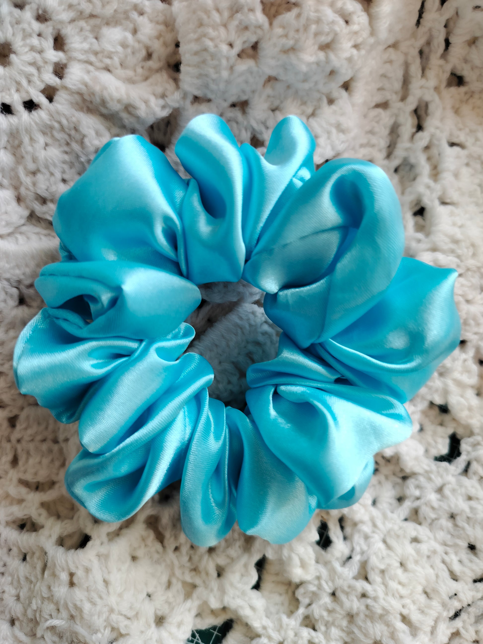 Handmade, pastel blue colour, soft satin scrunchie made using an elastic that grips your hair securely.